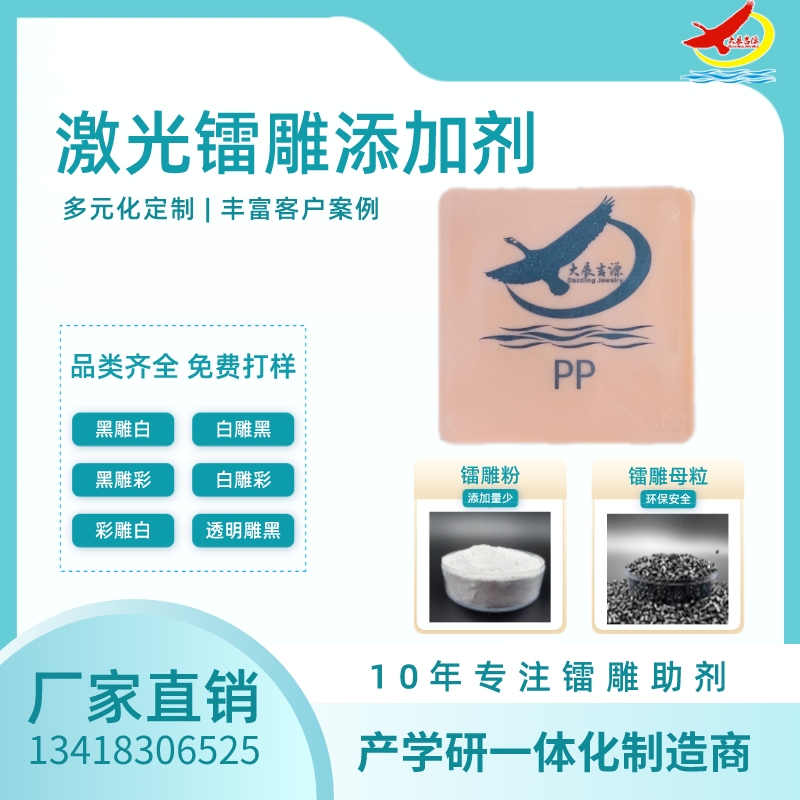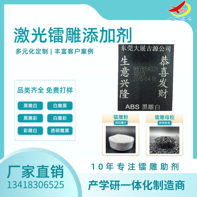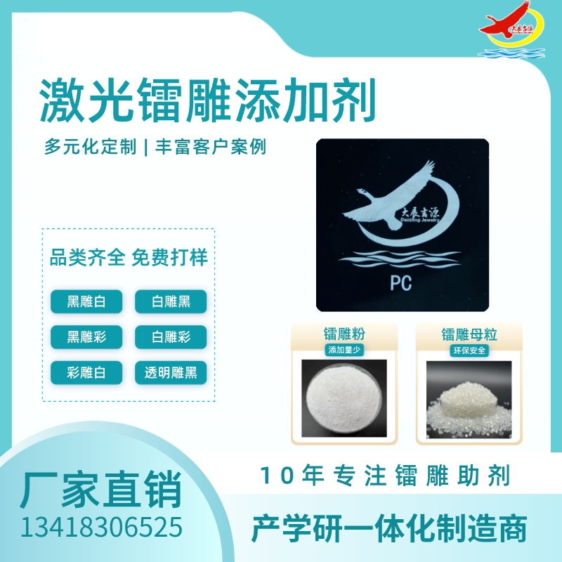 在原有的塑胶原料和改性塑料制品增加大展吉源自主生产研发的镭雕粉|激光粉|塑料镭雕助剂增加镭雕粉,成型之后镭雕出来就是白色或者黑色(黑色键盘雕出来是白色,白色键盘雕出来是黑色),不用再上色的。广东优质镭雕粉供应,镭雕粉生产厂家,镭雕粉价格,优质镭雕粉批发/采购,塑料镭雕粉选瑞鸿化工,用塑料材料做成的部件难免会要标记上一些logo、图文、字体之类的厂家信息以及产品参数使用说明等。但由于塑料材料基材的限制,用激光标记时会出现标记图文模糊不清晰,识别度不高等问题。加入了塑料镭雕粉后效果会提升很明显,很好的解决了上述问题,并且对基材本身的物性指标基本上没有任何影响。塑料镭雕粉适用于各类塑胶塑料制品镭雕效果不理想,字体颜色不美观,或者镭雕不上,同时可提高激光镭雕打标速度,提高打标效率,提高产量,增加效益。塑料镭雕粉适用范围包括PP,PC,PBT,PA,TPU,PS,PE,ABS等树脂产品激光镭雕黑雕白,黑雕金,彩雕黑,白雕黑。注塑成型时加入塑料镭雕粉,也可以直接和塑胶粒抽粒成镭雕料即可。
