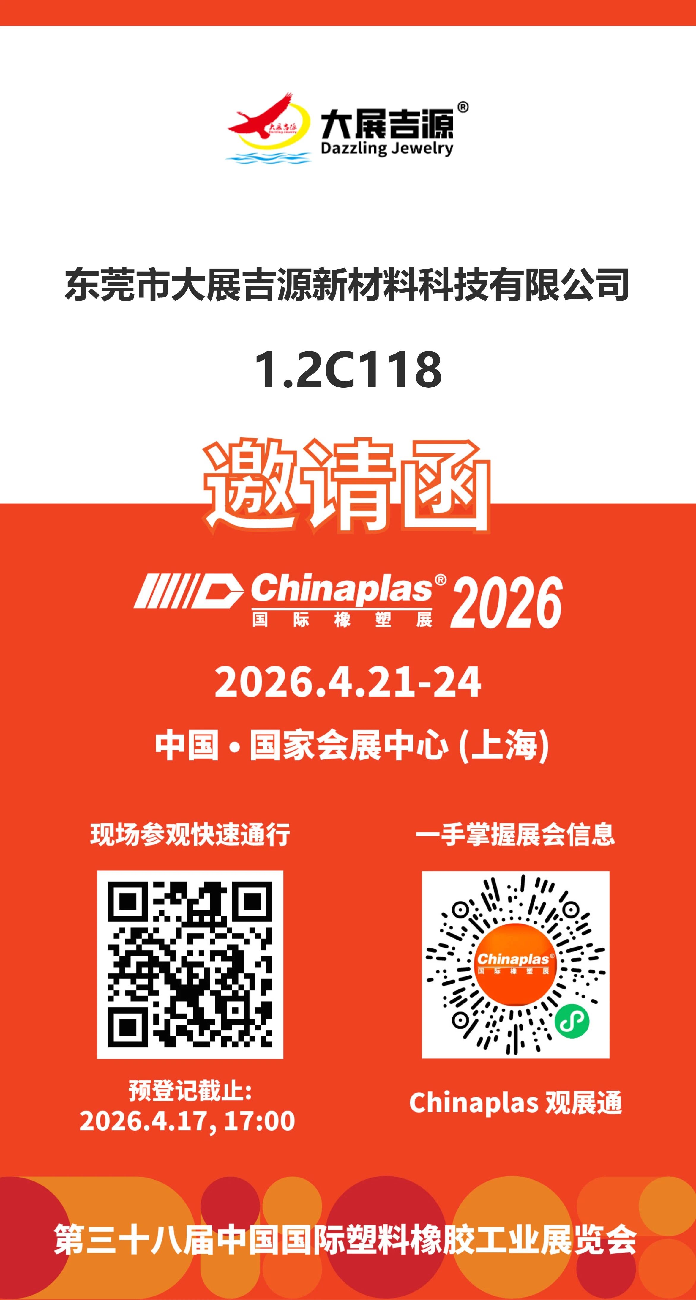 大展吉源诚挚邀请您参加 2026年4月21日至24日 于上海·国家会展中心(虹桥) 举办的第三十八届CHINAPLAS 国际橡塑展。本届展会以“变革·协作·共塑可持续”为主题,汇聚全球超4,600家展商,于逾39万平方米的展馆中共同呈现橡塑产业链的前沿技术与创新材料。