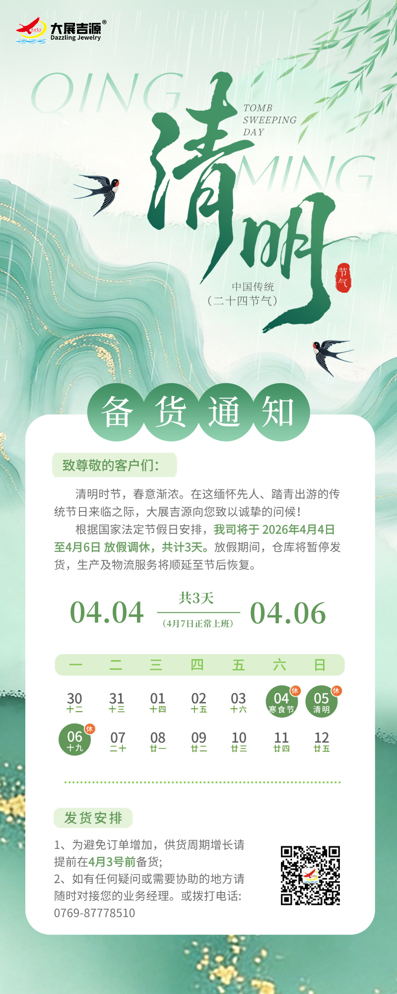 春和景明,清明将至。大展吉源温馨提示您:假期期间,我司将暂停发货,请您提前做好备货计划,确保节后生产无忧。