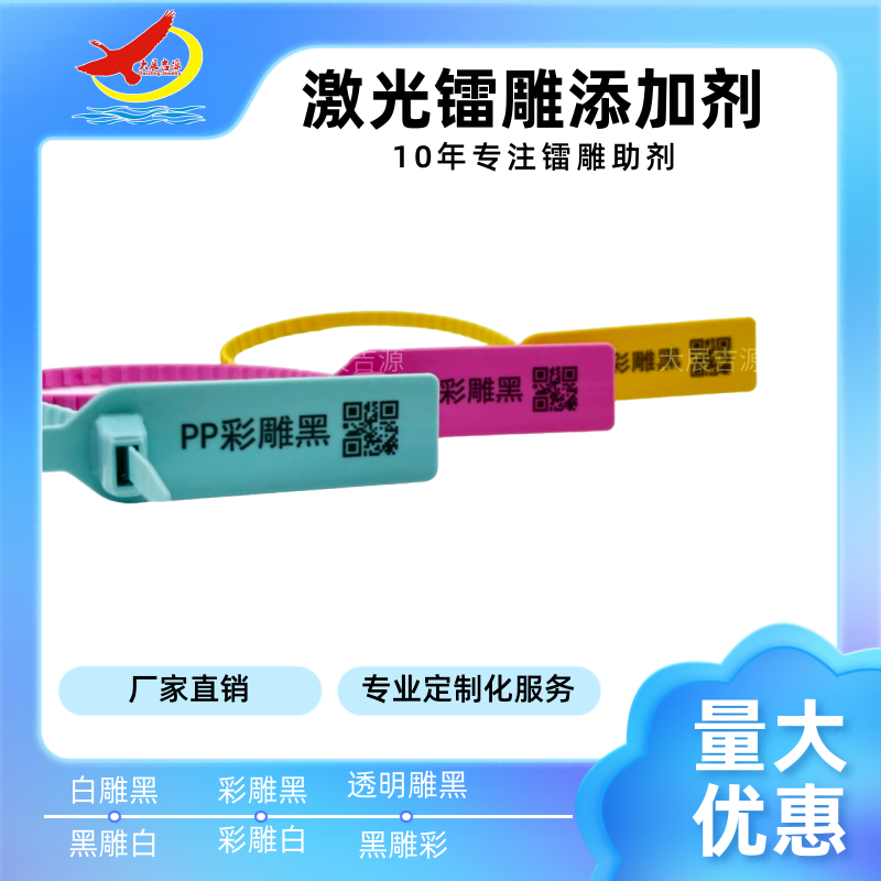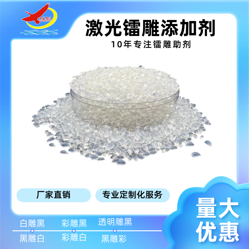 大展镭雕助剂它使下列处理成为可能对材料性质和颜色无任何影响。在过去仅能形成微小印记的,现在已经可以得到高清晰度的标记了而且标记清晰、牢固耐用、不会被机械、化学和物理因素作用而消失。